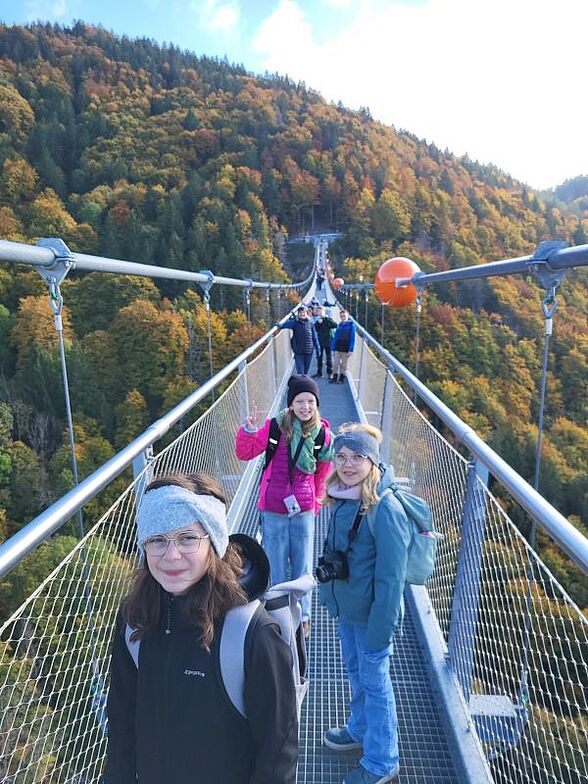 Schon Tage davor waren wir sehr aufgeregt! Am Montag ging es um 8.15 Uhr am Stadtbahnhof in Ettlingen los. Wir mussten zwar ein paar Mal umsteigen, waren aber auch schon bald an der Jugendherberge Hebelhof angekommen. Nachdem wir unsere Koffer abgestellt hatten, sollte es direkt zum Gipfel gehen. Zum Glück wurden wir damit überrascht, dass wir mit der Gondel fahren durften.