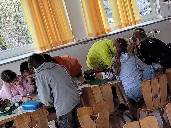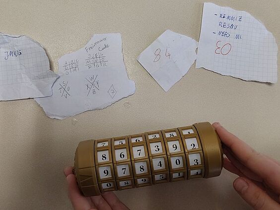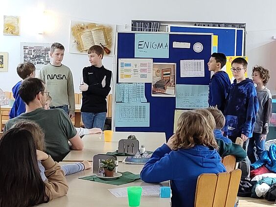 Die zweite Gruppe tauchte tief in die Welt der Verschlüsselungen ein. Zuerst einmal entschlüsselten sie 24 geheime Botschaften wie "öffne ein Fenster", "führe ein Kunststück vor", "springe vom Stuhl" oder auch "rufe laut: Heureka". Im Anschluss bekamen sie einen Überblick über die verschiedenen Arten der Verschlüsselung, die sie auf diese Weise bereits kennengelernt hatten. Die Köpfe rauchten als sie im Anschluss einen schwierigen Text aus dem Spionkoffer erfolgreich entschlüsselt haben. Viel Spaß machte das Entschlüsseln eines Zahlen-Tresors – dem sogenannten Kryptex. Darin versteckt waren Bonbons, aber nur der richtige Code gab sie frei. Besonders fasziniert waren die Schülerinnen und Schüler von der Enigma-Maschine, die jeden Buchstaben anders verschlüsselt – ein echtes Meisterwerk der historischen Kryptografie!