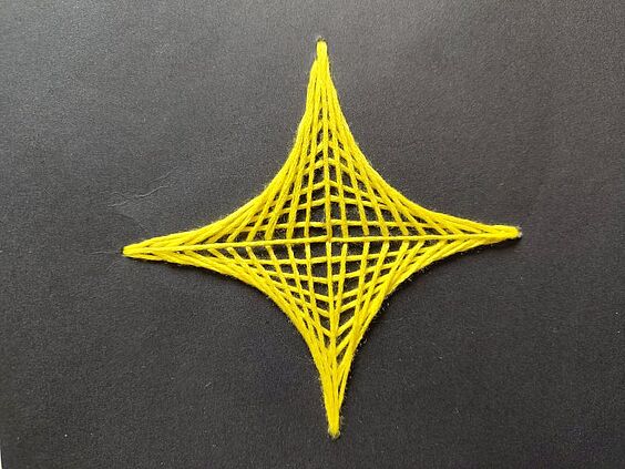 Die dritte Gruppe beschäftigte sich intensiv mit Pentominos und bastelten dazu auch einen Pentominokalender. Gemeinsam lösten sie das Geheimnis der Efron-Würfel und bastelten einen riesigen Sierpinski-Tetraeder. Zum Abschluss entstanden wunderschöne Fadenbilder, bei denen runde Formen aus geraden Fadenstücken entstehen.