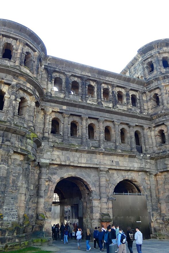 Nach der gemeinsamen Bahnfahrt erreichten wir nach einem kurzen Fußweg unsere Jugendherberge. Schon auf dem Weg dorthin konnten wir viele Eindrücke sammeln: antike Mauern, alte Kirchen und die Porta Nigra – die berühmteste Sehenswürdigkeit, nämlich das Stadttor Triers.