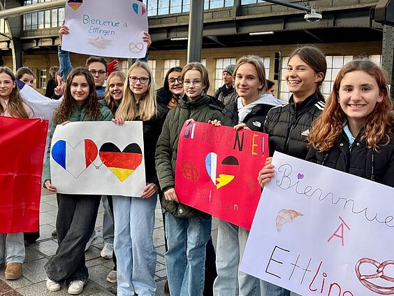 Die 23 Schülerinnen und Schüler des Collège Notre Dame, von denen einige im letzten Jahr schon am AMG waren, wurden sehr herzlich von den AMG-Familien aufgenommen und bereits am Bahnsteig in Karlsruhe mit Willkommensplakaten jubelnd empfangen.
