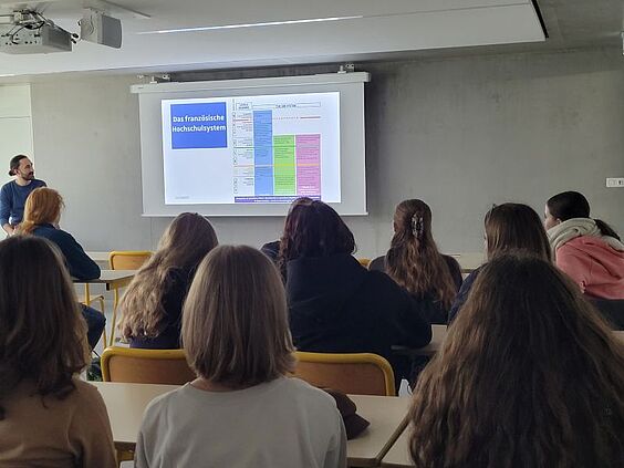 Am Nachmittag empfing das Büro für internationale Beziehungen die Schülerinnen und Schüler und informierte über Studienmöglichkeiten für zukünftige Abiturientinnen und Abiturienten. Dabei wurden unter anderem die Deutsch-Französische Hochschule und der Eurocampus vorgestellt, die bi-nationale Studiengänge und Austauschprogramme anbieten.