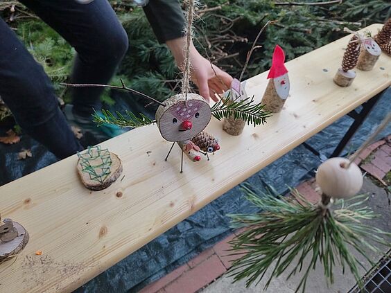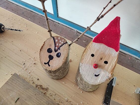 Die Kinder gestalteten unter anderem kleine Figuren, Anhänger und weihnachtliche Dekorationen. Dabei wurde gesägt, gebohrt, gebunden und kombiniert. Die Bilder zeigen eindrucksvoll, wie konzentriert und mit wie viel Freude gearbeitet wurde und wie vielfältig die Ergebnisse ausfielen. Auch die Waldbox selbst mit ihrem umfangreichen Materialangebot war für die Kinder ein echtes Highlight.